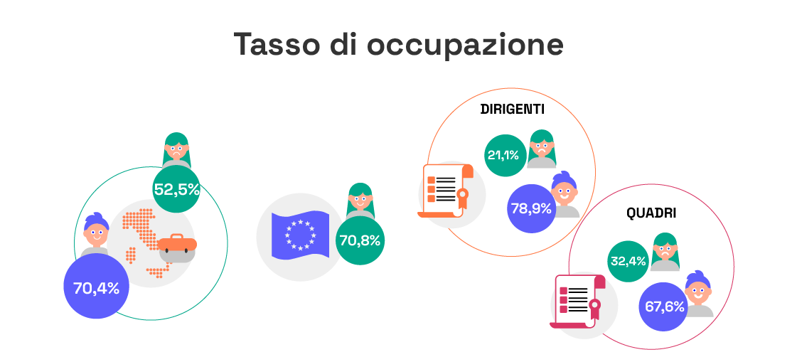 Il distacco delle percentuali di occupazione – 70,4% per gli uomini contro 52,5% per le donne – si traduce in minori opportunità di reddito, carriera e accumulo di risparmio per le donne, che sono anche più spesso impiegate in lavori part-time (non sempre per scelta volontaria) precari o a bassa retribuzione, e sono sottorappresentate nei ruoli dirigenziali1.